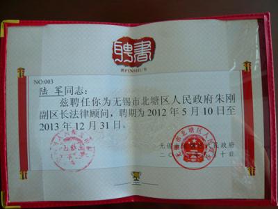 陆军律师被聘请为无锡市北塘区“区长法律顾问”