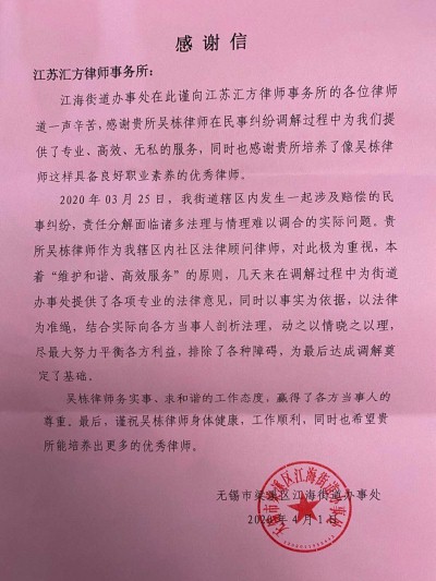 事情发生在2020年03月25日,江海街道辖区内发生一起重大民事纠纷案件,由于赔偿数额巨大,责任分解是面临诸多法理与情理难以调合的实际问题。江苏汇方律师事务所的吴栋律师作为该街道辖区内法律顾问律师,对此极为重视,本着“维护和谐、高效服务”的原则,几天来在调解过程中为街道办提供了各项专业的法律意见。
