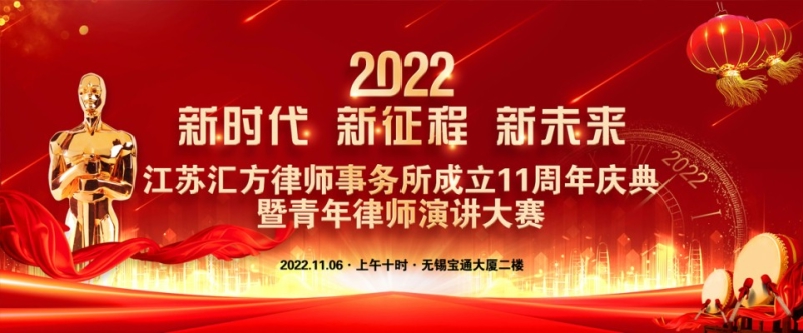 金黄的山脉、紫红的田棉,大地正是丰收的季节!2022年11月6日,新时代、新征程、新未来——江苏汇方律师事务所成立11周年庆典暨青年风采演讲大赛在宝通大厦隆重举行。律所全体律师、行政人员及各界友好人士现场参加了本次活动。
